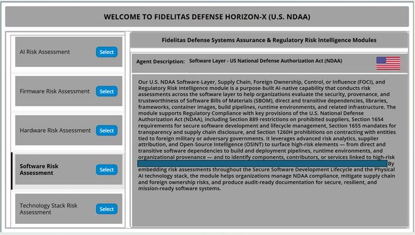 HORIZON-X — a browser-accessible, AI-native Platform via SaaS — supports Systems Assurance, Supply Chain, Foreign Ownership, Control, or Influence (FOCI), Cyber, and Regulatory Risk Management for Physical AI, Robotics and Autonomous Systems (PAI-RAS).