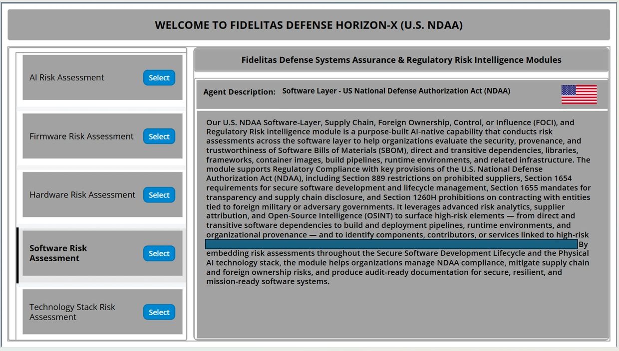 HORIZON-X — a dual-use, AI-Native Deep Tech Platform via SaaS — is custom-built to address the unique risk challenges of Physical AI, Robotics, and Autonomous Systems (PAI-RAS) and is deployed on Microsoft Azure Commercial and Government Clouds. It supports Systems Assurance, Technology Diligence, Foreign Ownership, Control, or Influence (FOCI), Cyber, and Regulatory Risk Management, aligning with U.S. and EU standards.